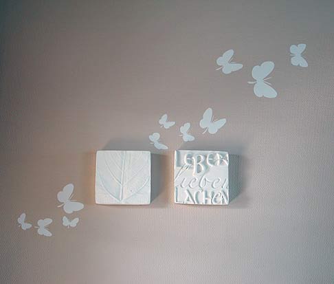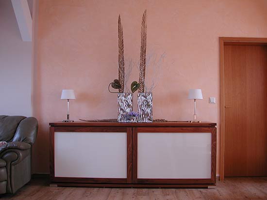 Dekoration mit gelieferten Accessoires (Gefäße, Tisch, Stühle und Bilder)